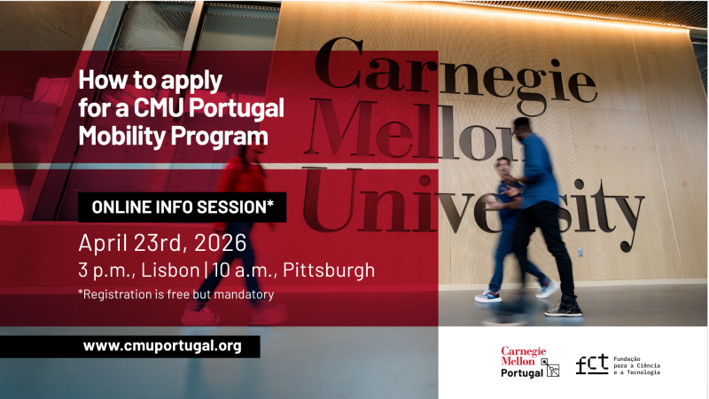 On April 23rd, at 3 p.m. Lisbon I 10 a.m. Pittsburgh, we will walk you through the application process for both CMU Portugal Mobility initiatives, “Visiting Students” and “Visiting faculty & Researchers”, which will be open between April 16th and May 14th.