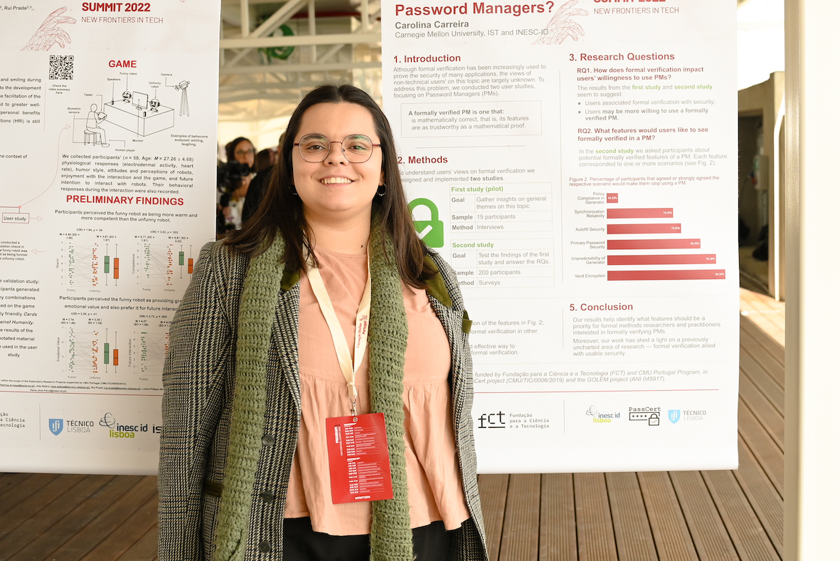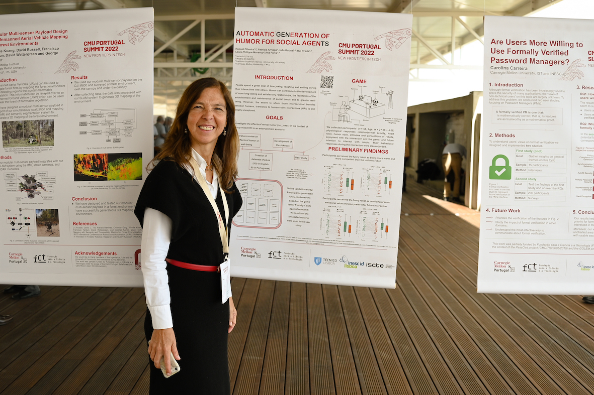 The CMU Portugal Program Summit 2022 “New Frontiers in tech” counted with a high participation of CMU Portugal students, with 54 posters submitted, allowing them to present their research work at the Poster Sessions held throughout the Summit. The posters were exhibited during the two-day event at Factory Lisbon rooftop. They were a great way for students to interact with CMU Portugal Community during coffee and lunch breaks. The Exhibit continues even after the end of the meeting with all the posters available online- E-Posters.