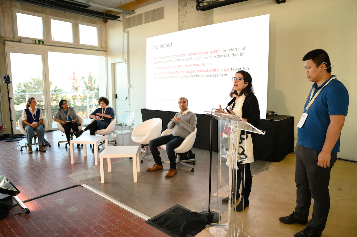 Mahmoud Tavakoli, from ISR Coimbra (Universidade de Coimbra) explained the goal of “Exoskins: AI Codesign of Robotic and Personalized Compliant Exoskins for Physical Exercises, Prosthesis and Rehabilitation.”, followed by Jodi Forlizzi who is leading the “shiftHRI: Exploring the Transfer of Agency to Older Adults in HRI” project at CMU; and last Cláudia Soares (FCT NOVA) and Qiwei Han (NOVA SBE) introduced “MD2TRUST: Trustworthy data science for improving healthcare efficiency: the case of the medical referral process”.