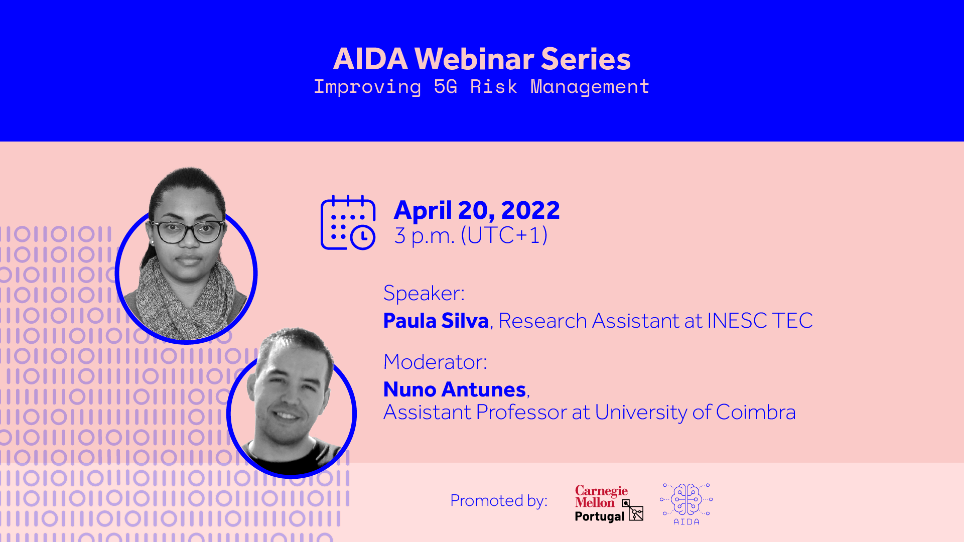 The “AIDA Webinar Series I Improving 5G Risk Management” will count with a total of five (5) Webinars held every two months from December 2021 to September 2022, gathering leading experts from academia to industry involved with the project.